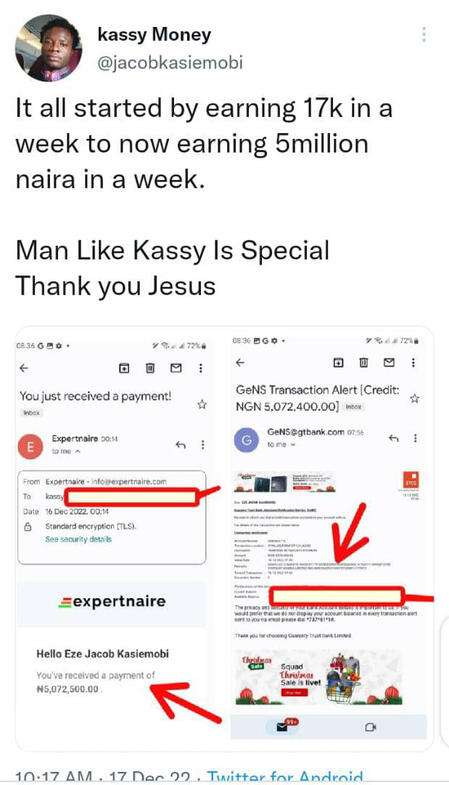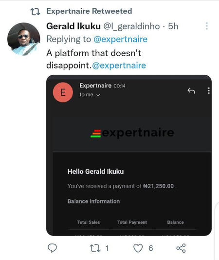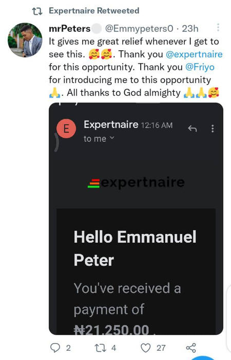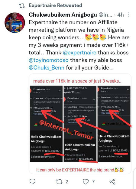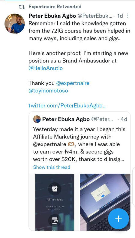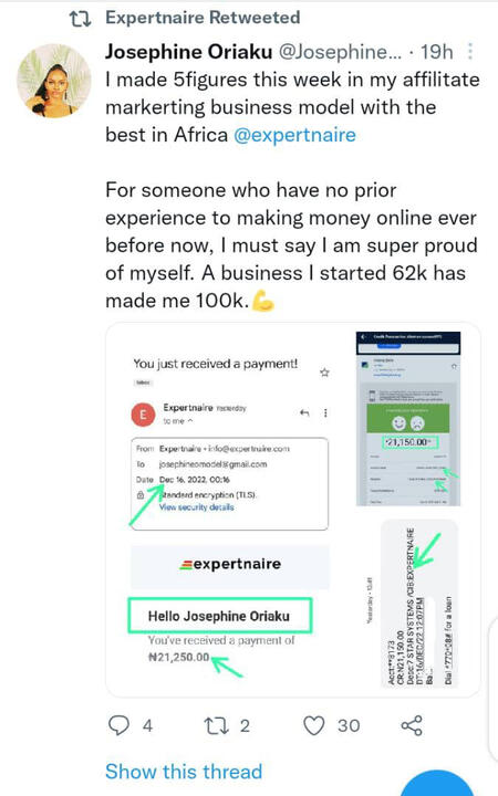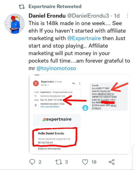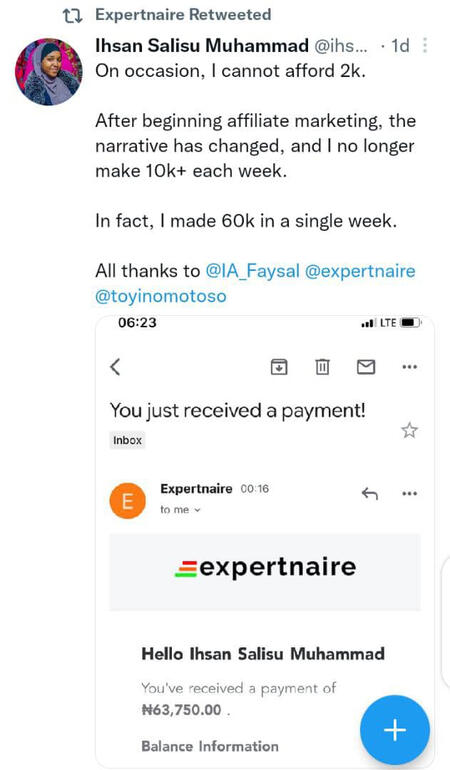 These testimonies are from live and active accounts on Twitter, so you can use the Twitter handles to verify the owners and even ask them to confirm their testimonies. I am sure they will be happy to share. These people were like you, a new beginner a few months ago, but this is where taking action has brought them.Now, these testimonies are only a few of what we are seeing every day working as affiliate marketers and using the best affiliate networks like Expertnaire.If you are A newbie in affiliate marketing, this will be a life changer for you if you apply the few technics you will be learning from our coaching.The name of our affiliate platform as you may already know is Expertnaire.What's Expertnaire?Expertnaire is an online marketplace that sells DIGITAL products that other people other than Affiliates created. And these products don’t have stock.That is to say, these products can’t finish because they are DIGITAL (E-books, Videos)Examples of such products: are The Affiliate Billionaire ABC, 72IG WhatsApp Income Blueprint + Implementation Program B92, Viral YouTube Monetization, Natural Weight Loss, Pain-free Childbirth, Real Estate marketing secrets, Copywriting course, Freelancing, Facebook & Google Ads courses and so so many more…And these are products that people are looking for solutions to.All these different products have their specific sale commission.That is to say: a product on weight loss may pay you as much as 50% while a product on “make money” can pay you as much as 40%.So, as affiliates, we can sell as much as we want and make as much as we can.Again, this is an automated system that once you record a sale, you get paid automatically because the system has been set up to pay you a certain commission for any successful sale!This system of making money online selling other people’s products is called AFFILIATE MARKETING.How Does It Simply Works?I select a product of choice from my dashboard.And by implementing the training I got from the training, I will recommend this product to people who need it.If this person buys it, I get paid N25,000 (assuming that’s my commission)So if I want to make N250,000 per month, I have to sell 10 of these products.To make 500k a month, I’ve to sell just 20.And remember these products no dey finish.So you can just keep using the technics you will learn to keep selling and keep earning.